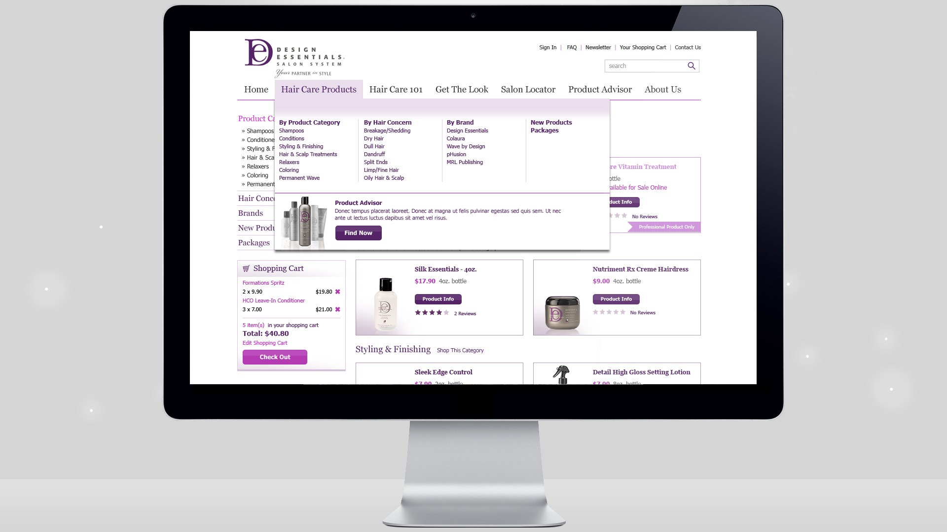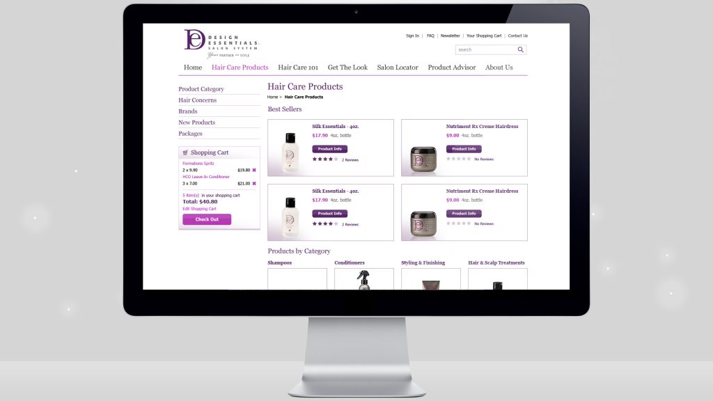 Design Essentials offers quality hair care solutions with a focus on customer education for better results at home or in the salon. This website illustrates the company’s philosophy by combining elegant design with detailed product descriptions.